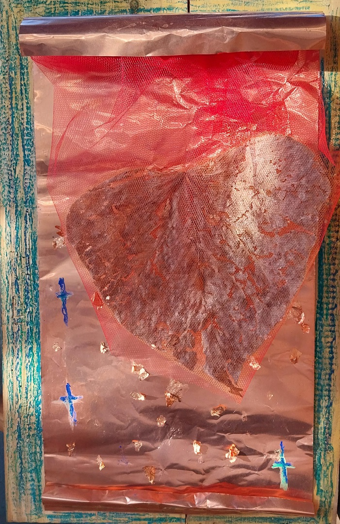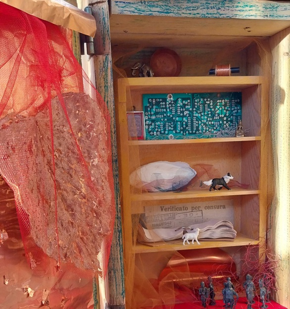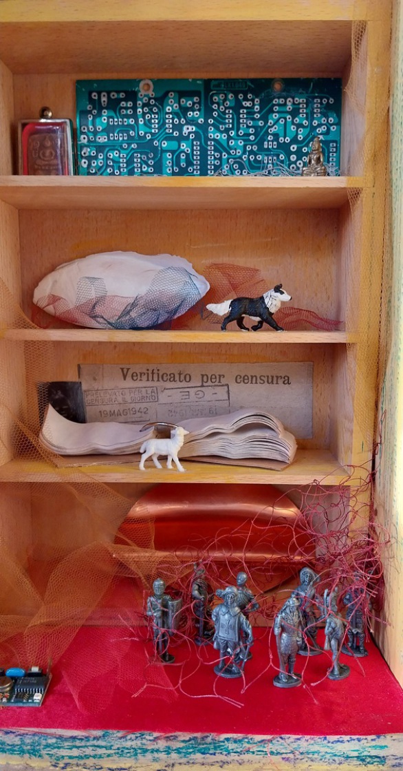 Cassetta militare, fogli e oggetti in rame, microchip,soldatini di piombo, rete, tulle colorato, foglia di paulonia,, osso di seppia, pastelli a olio, altro