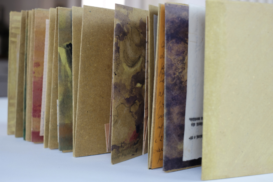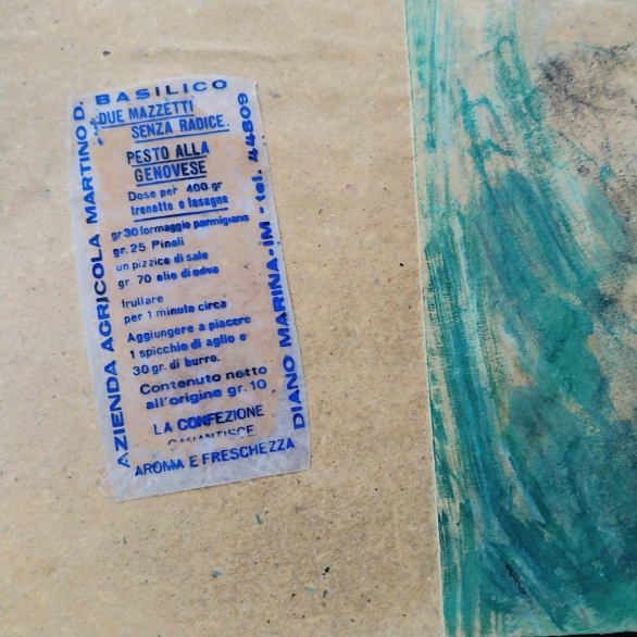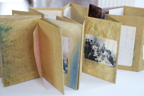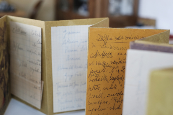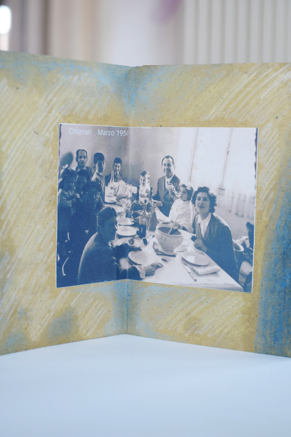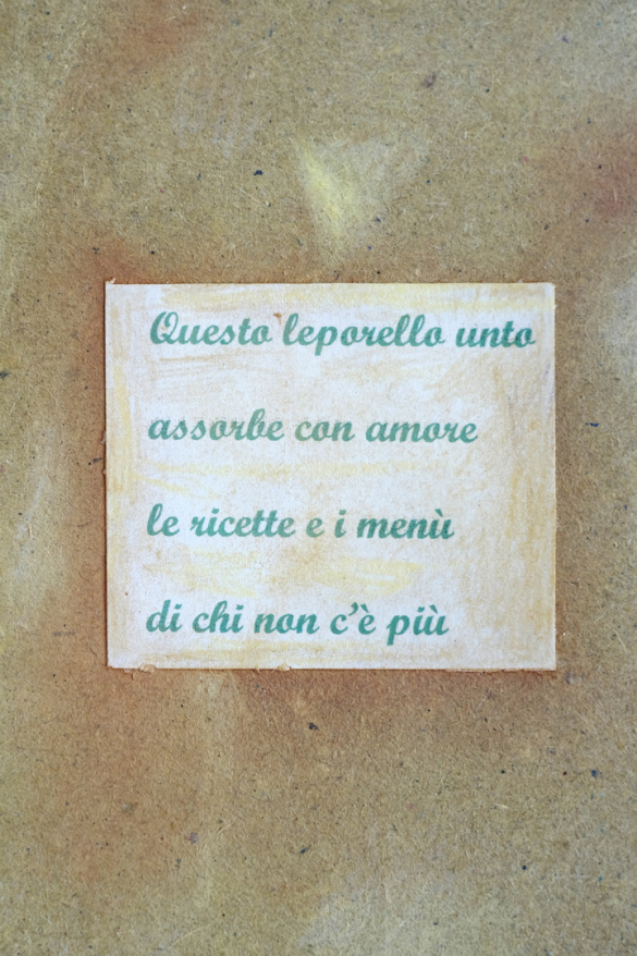 Carta paglia unta di olio, ricette familiari di cucina scritte a mano, pastelli ad olio, acquerelli, stampe da foto di famiglia.